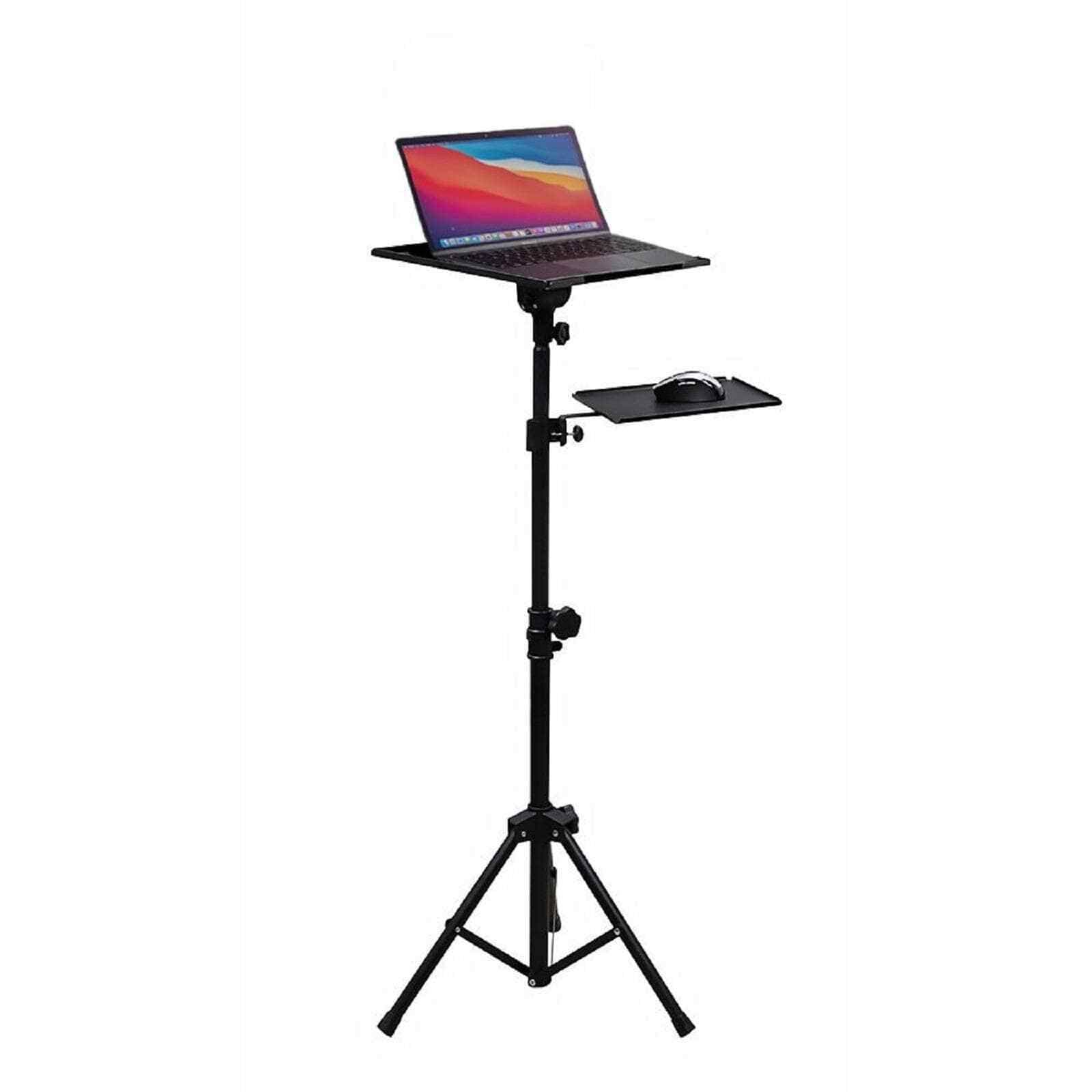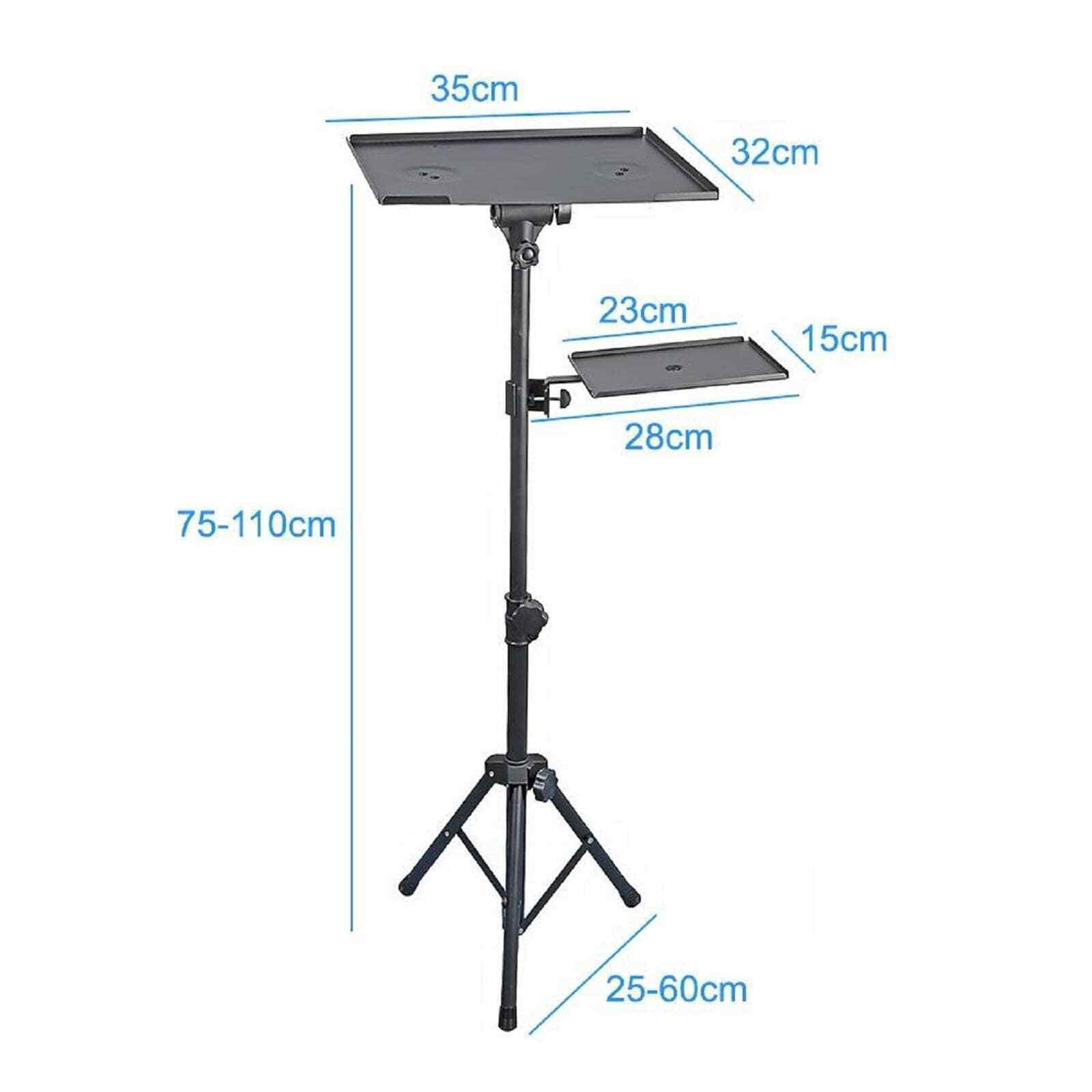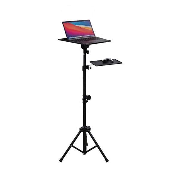 Features: Adjustable tilt top shelf for laptop or projector Additional shelf for mouse pad or accessory (adjustable) Height adjustable: 750 - 1100mm Max Load: 15kg